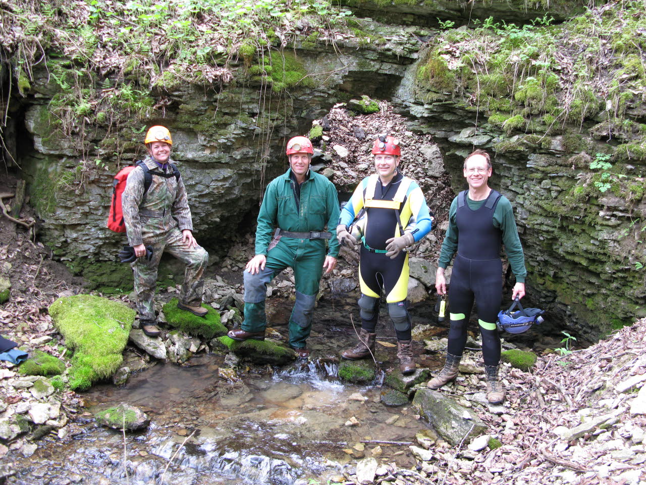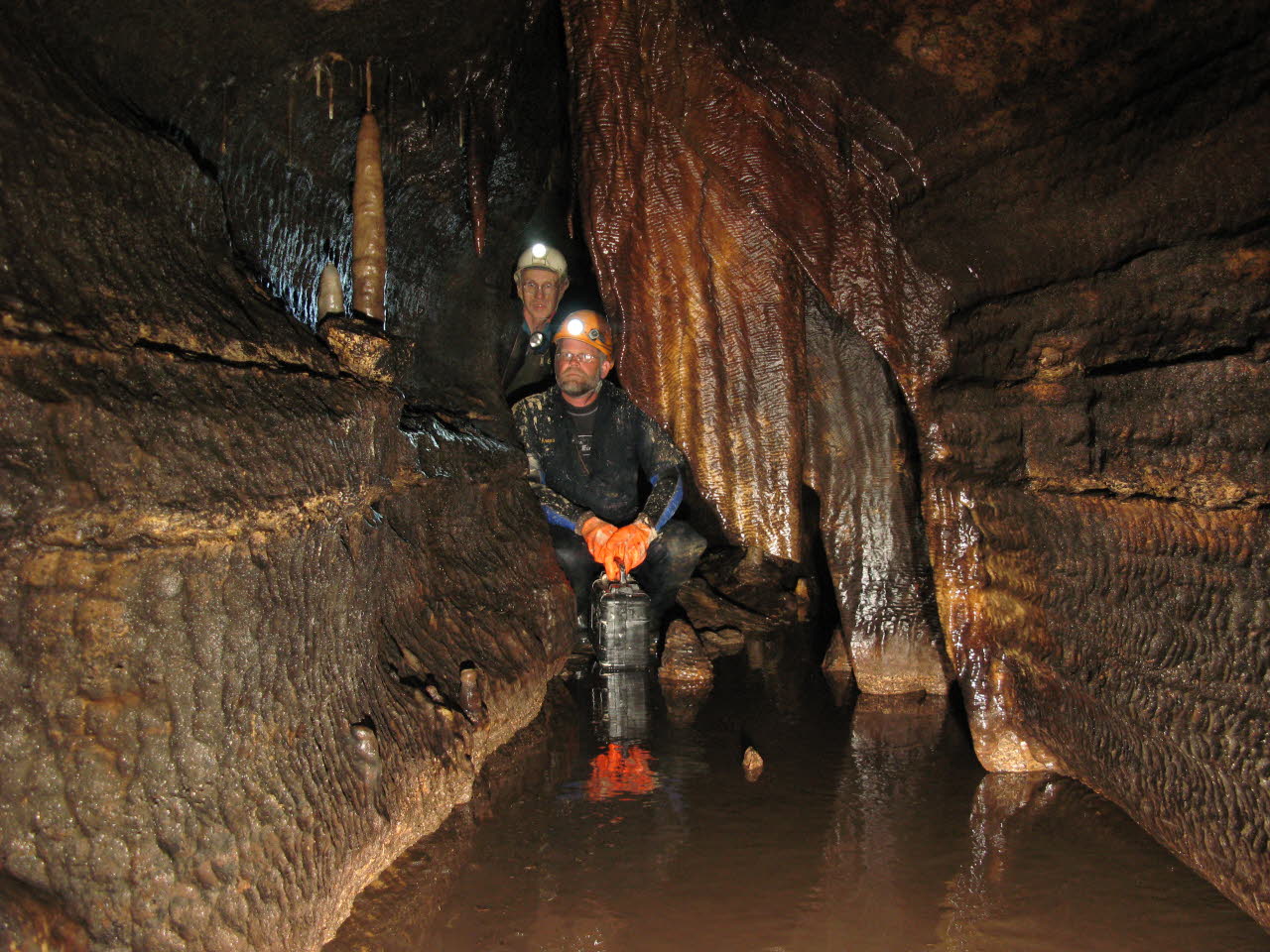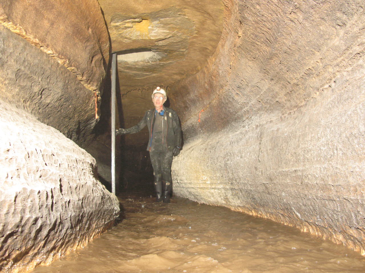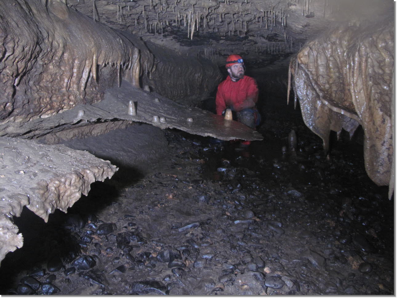 Bat River Cave, located in S.E. Minnesota, was home to the largest concentration of roosting bats (in any natural cave) in the Upper Midwest before White Nose Syndrome disease desecrated the population. The original portion of this cave has been known to exist since pre settlement times. However, in 2007 John Preston, outfitted with SCUBA gear, dove through a water filled sump at the end of the cave and discovered a huge room with a tremendous waterfall crashing down into it. He reported that the cave continued ahead, and shortly thereafter John Ackerman and Phil Gemuenden followed Preston through the sump and explored over one mile of spacious decorated passages lined with bats. A safe man made entrance has now been created to further exploration and scientific studies. To date, 2.84 miles of cave passages have been explored. Read the STORY View the MAP Read the HISTORY |