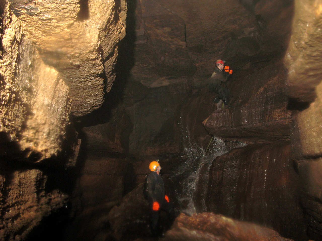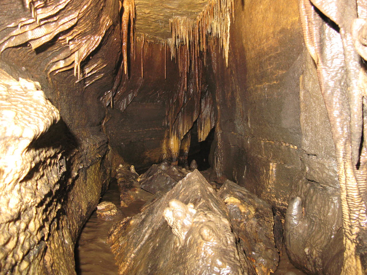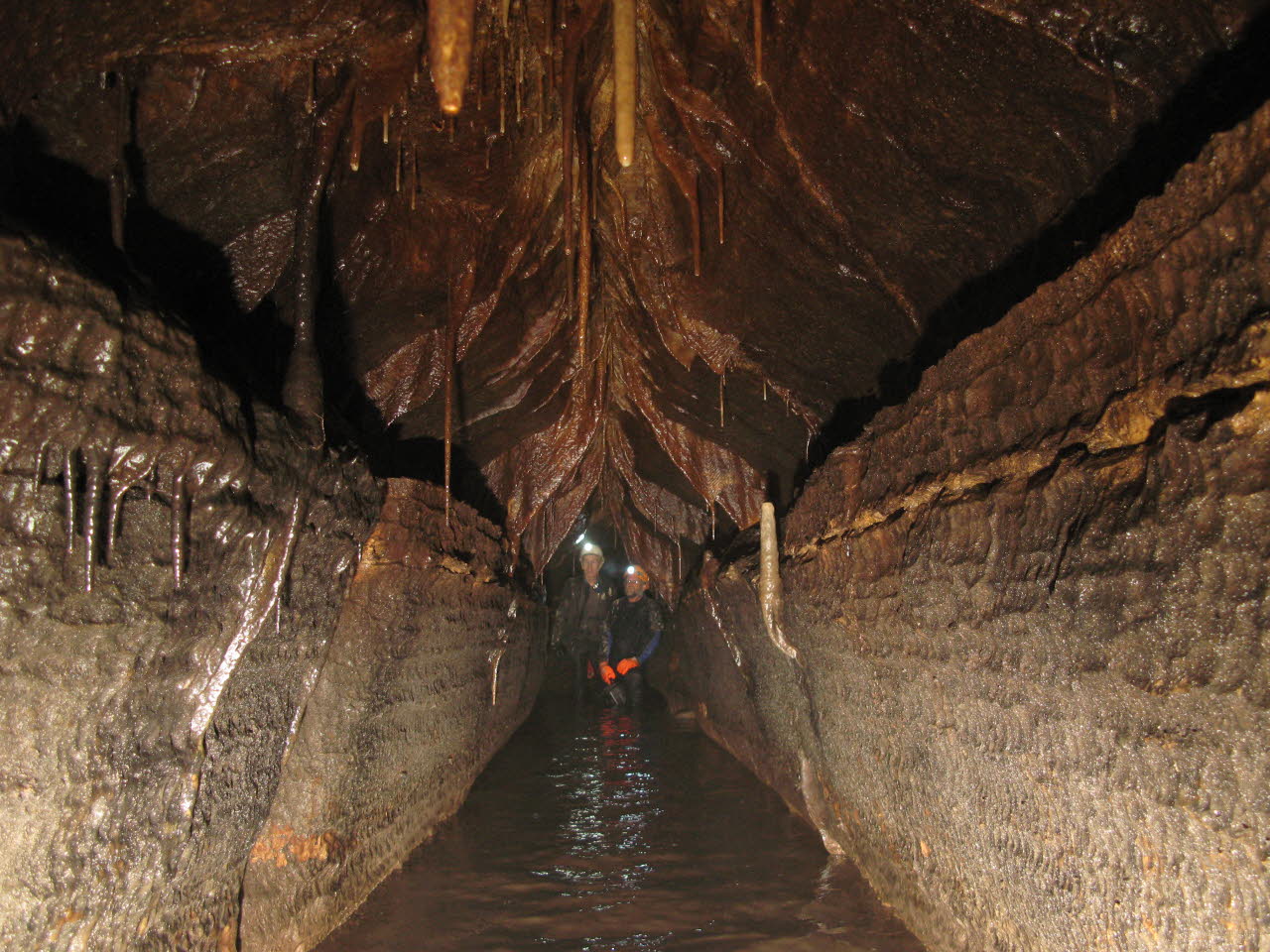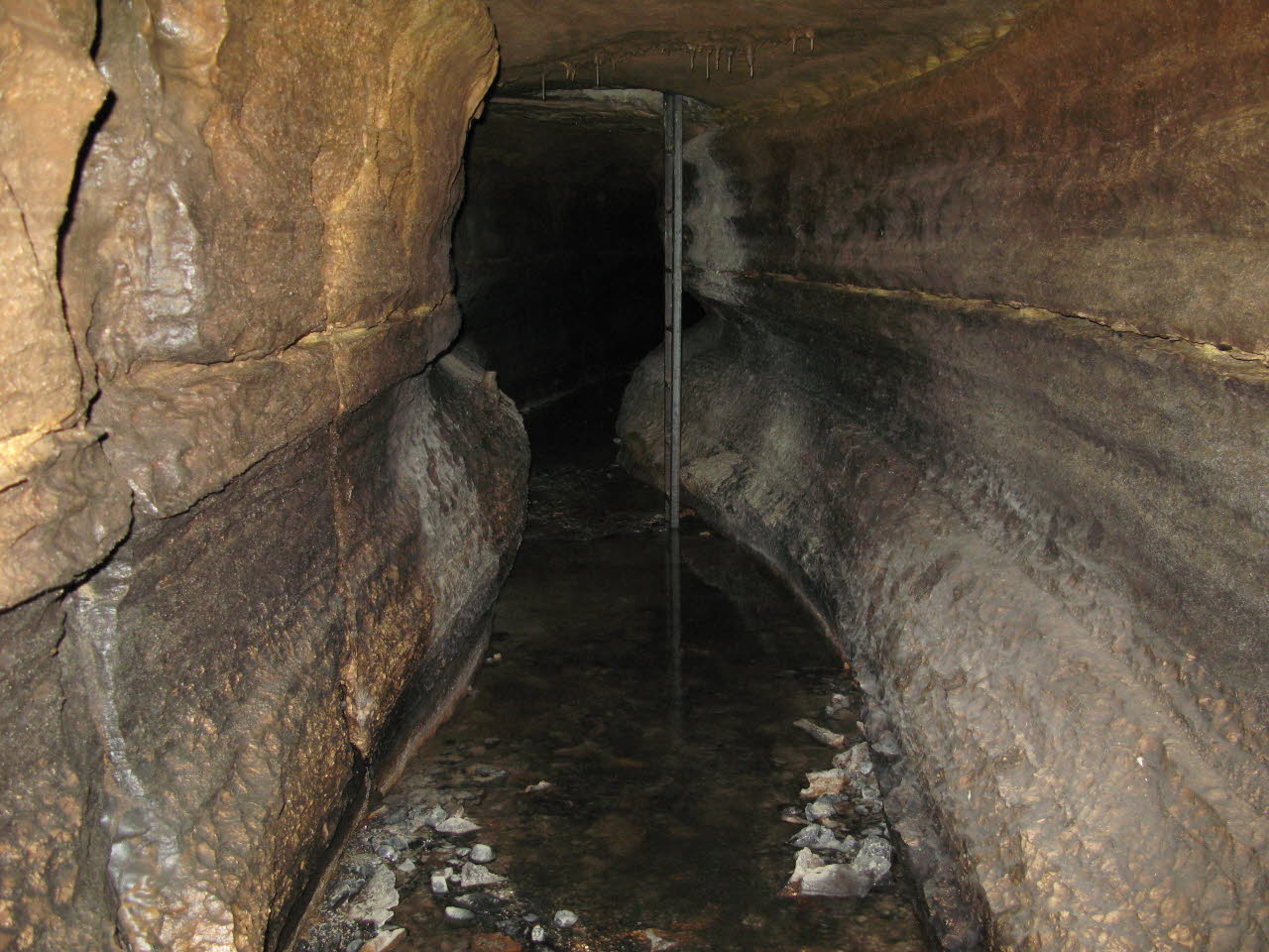 Bat River Cave, located in S.E. Minnesota, was home to the largest concentration of roosting bats (in any natural cave) in the Upper Midwest before White Nose Syndrome disease desecrated the population. The original portion of this cave has been known to exist since pre settlement times. However, in 2007 John Preston, outfitted with SCUBA gear, dove through a water filled sump at the end of the cave and discovered a huge room with a tremendous waterfall crashing down into it. He reported that the cave continued ahead, and shortly thereafter John Ackerman and Phil Gemuenden followed Preston through the sump and explored over one mile of spacious decorated passages lined with bats. A safe man made entrance has now been created to further exploration and scientific studies. To date, 2.84 miles of cave passages have been explored. Read the STORY View the MAP Read the HISTORY |
