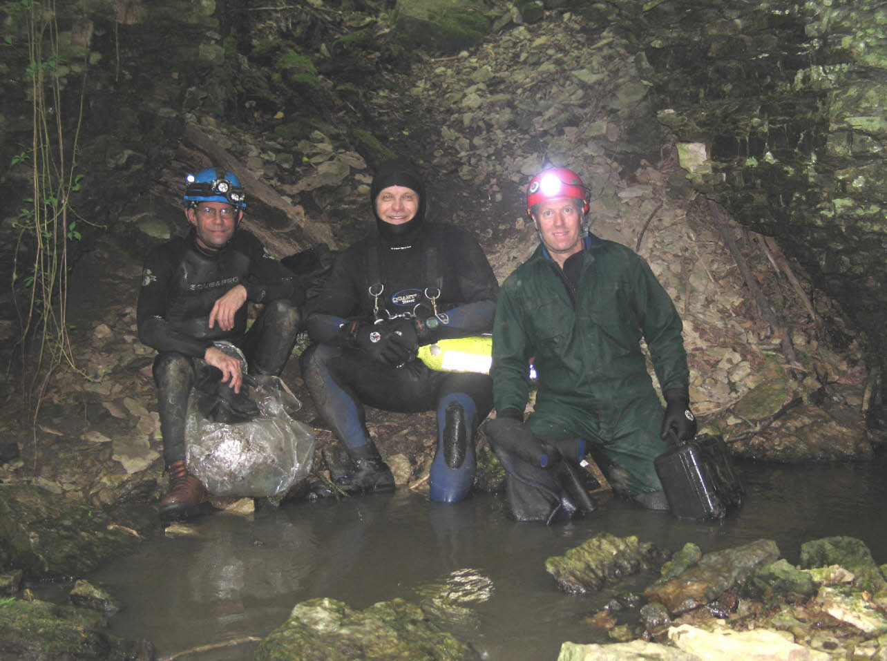Stenerson, John Preston and John Ackerman prepare to enter the cave to dive the sump. |