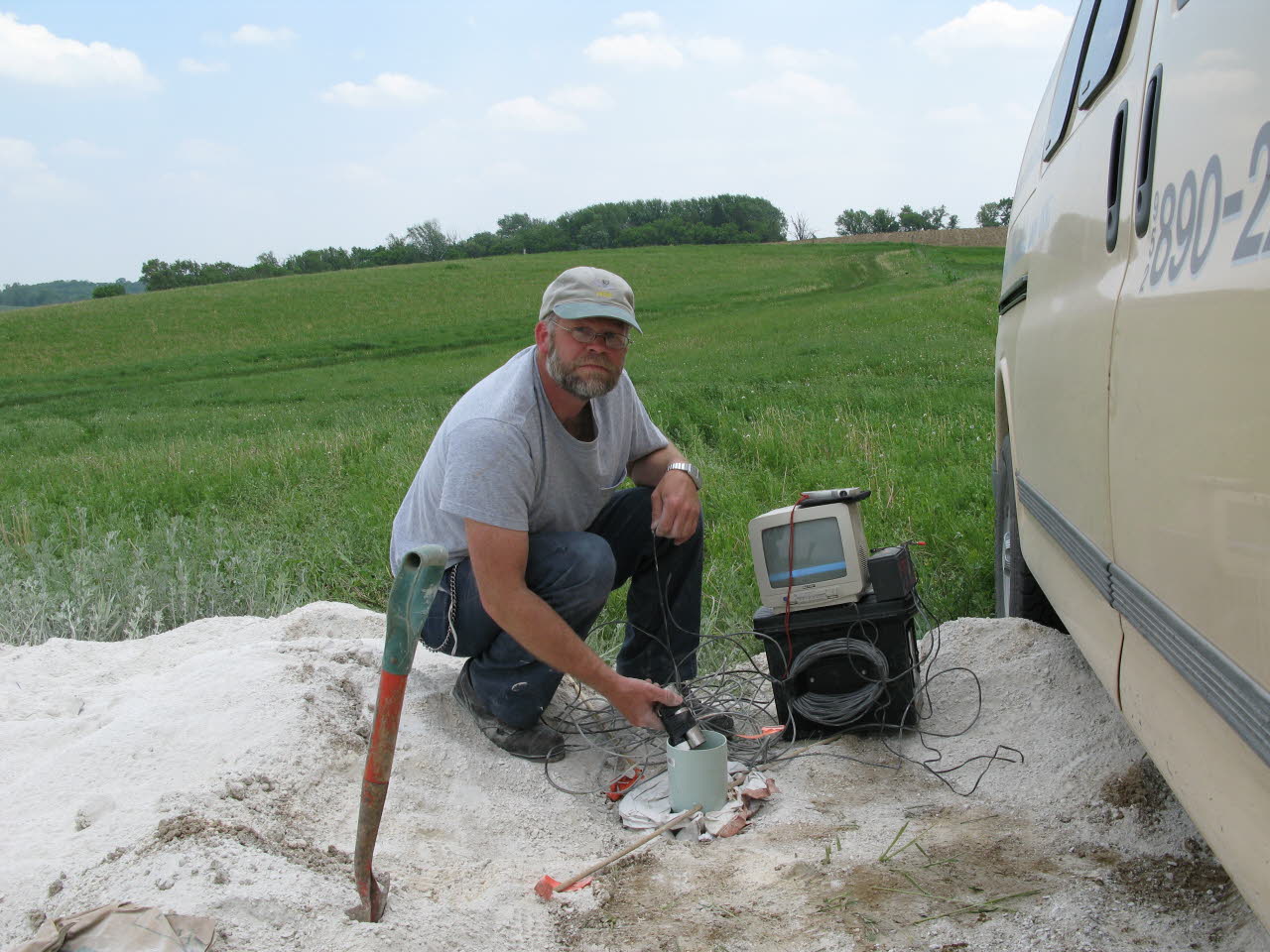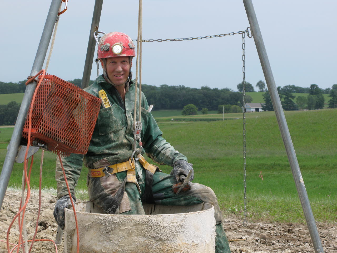 lowered into the cave to verify the exact proposed entrance location. Success! The main cave passage is clearly visible 65 feet below the surface. |