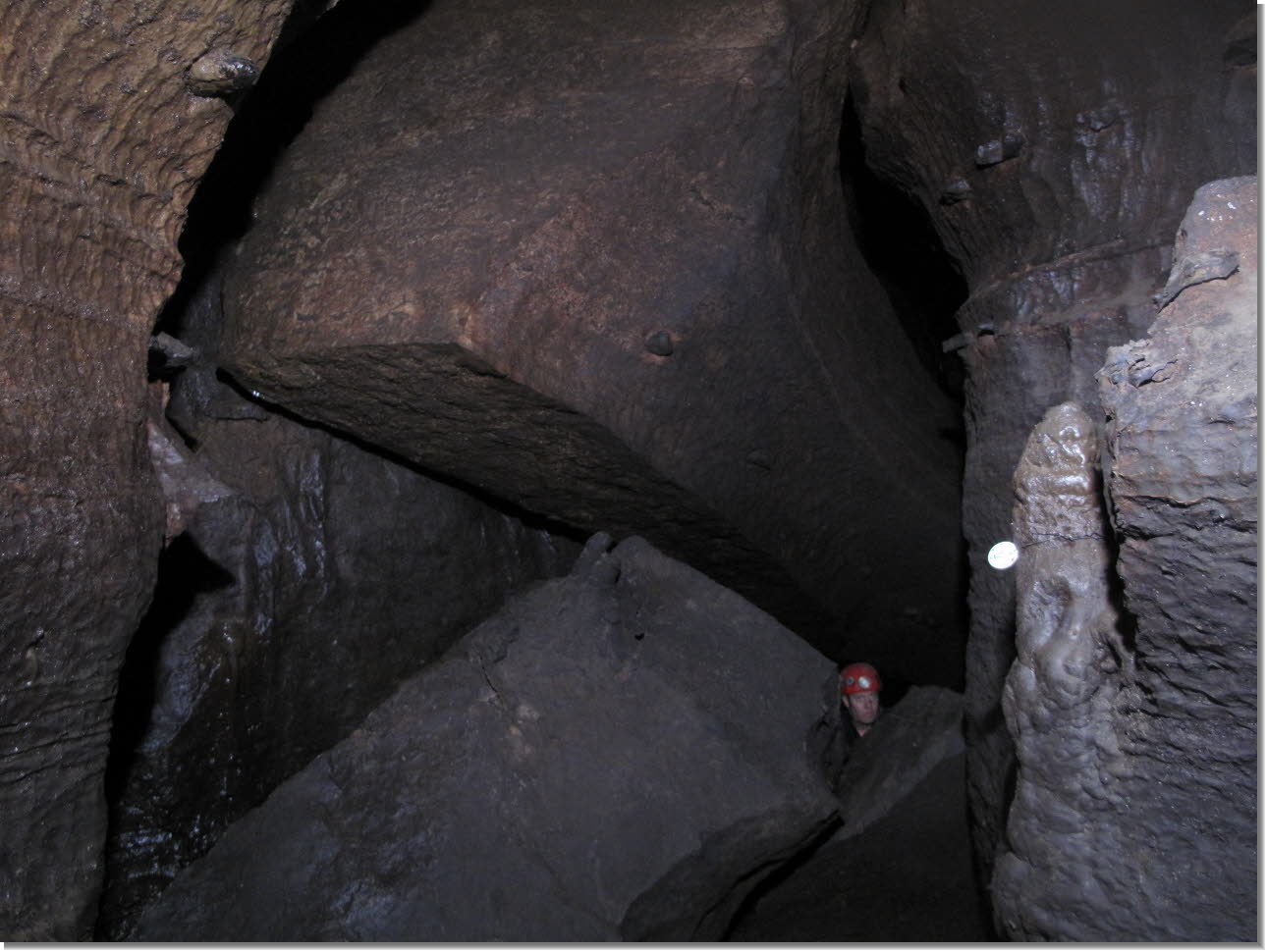 If these huge breakdown rocks would have fallen completely to the floor they would have blocked the passage and we never would have discovered the rest of the cave. |