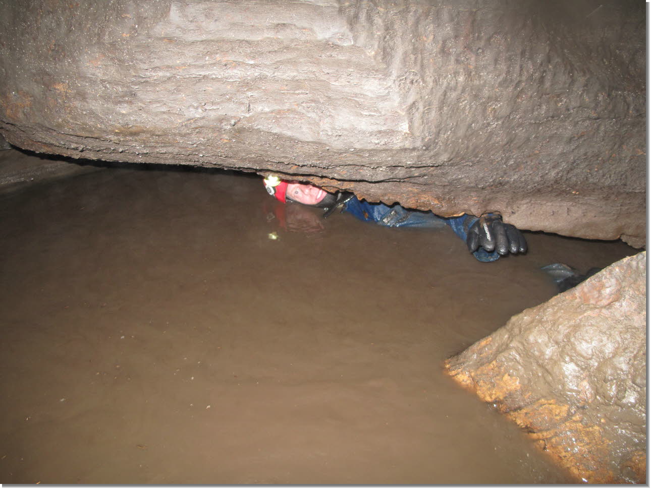 Multiple exploration trips were conducted upstream from the new entrance. After sliding on our stomachs for 1,800 feet (through 48 degree water in low air spaces) the ceiling abruptly rose to 30' and we found ourselves exploring a huge cave segment. Eventually the ceiling height diminished, and John Ackerman moved ahead for several hours with only inches of air space. Amazingly, the ceiling once again rose suddenly to over 60 feet, and another large cave segment was discovered! The cave length is now 2.84 miles as exploration continues.. |