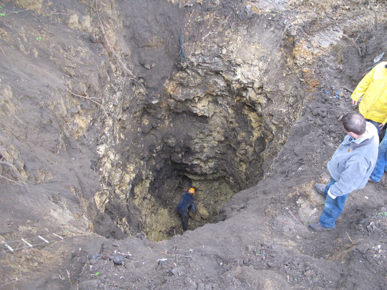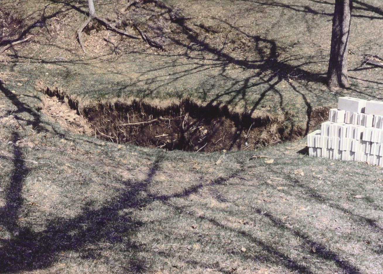 The force of a falling rock from above can easily break a neck or back. This sinkhole has been excavated, and a small gap was uncovered in the base. A cave was later discovered. |