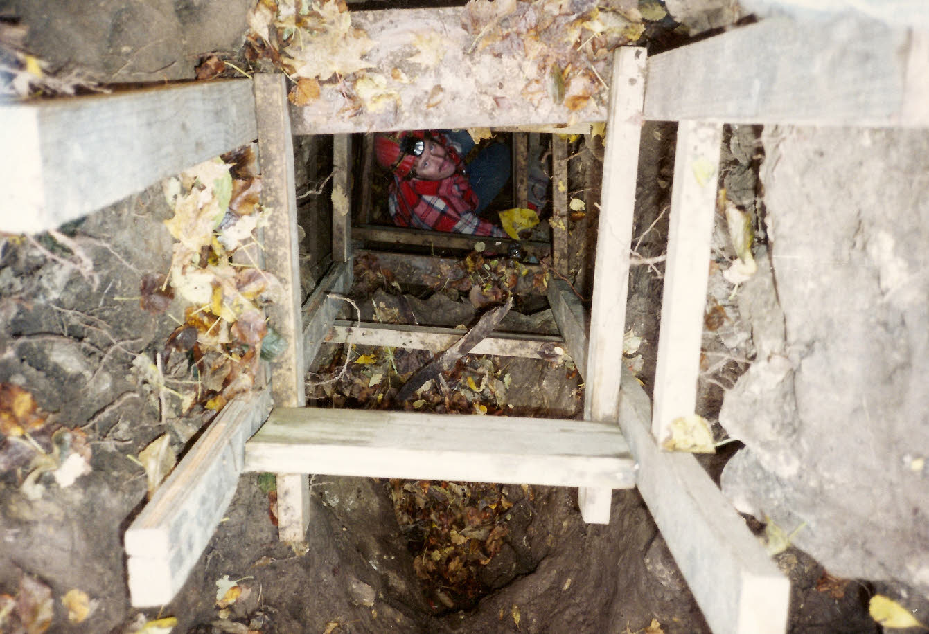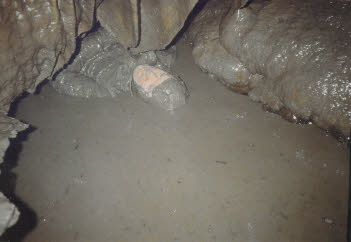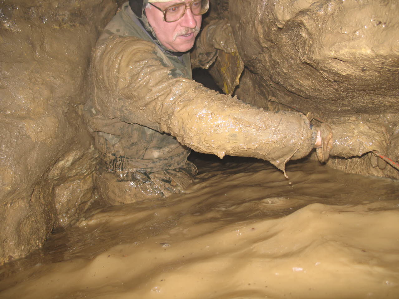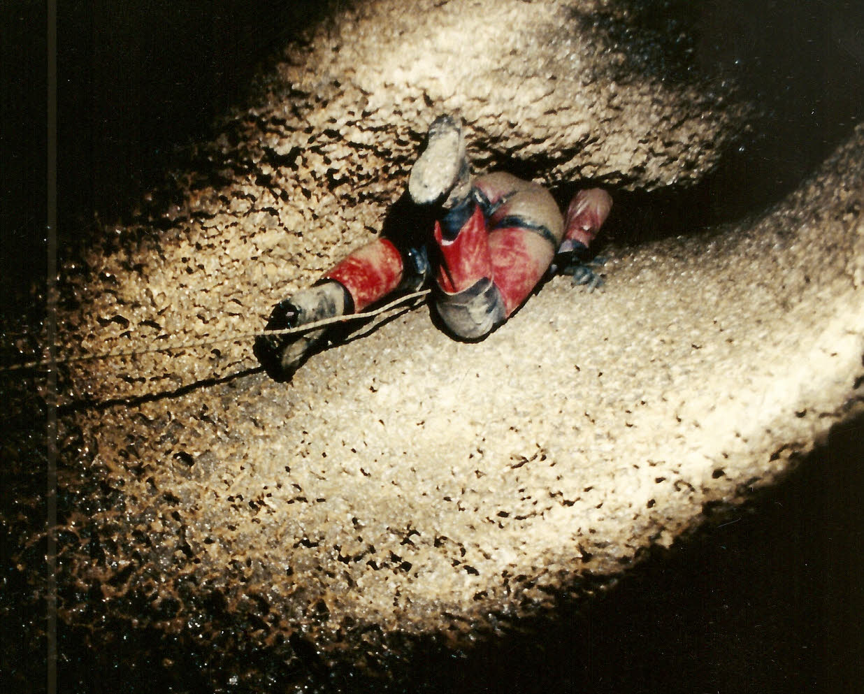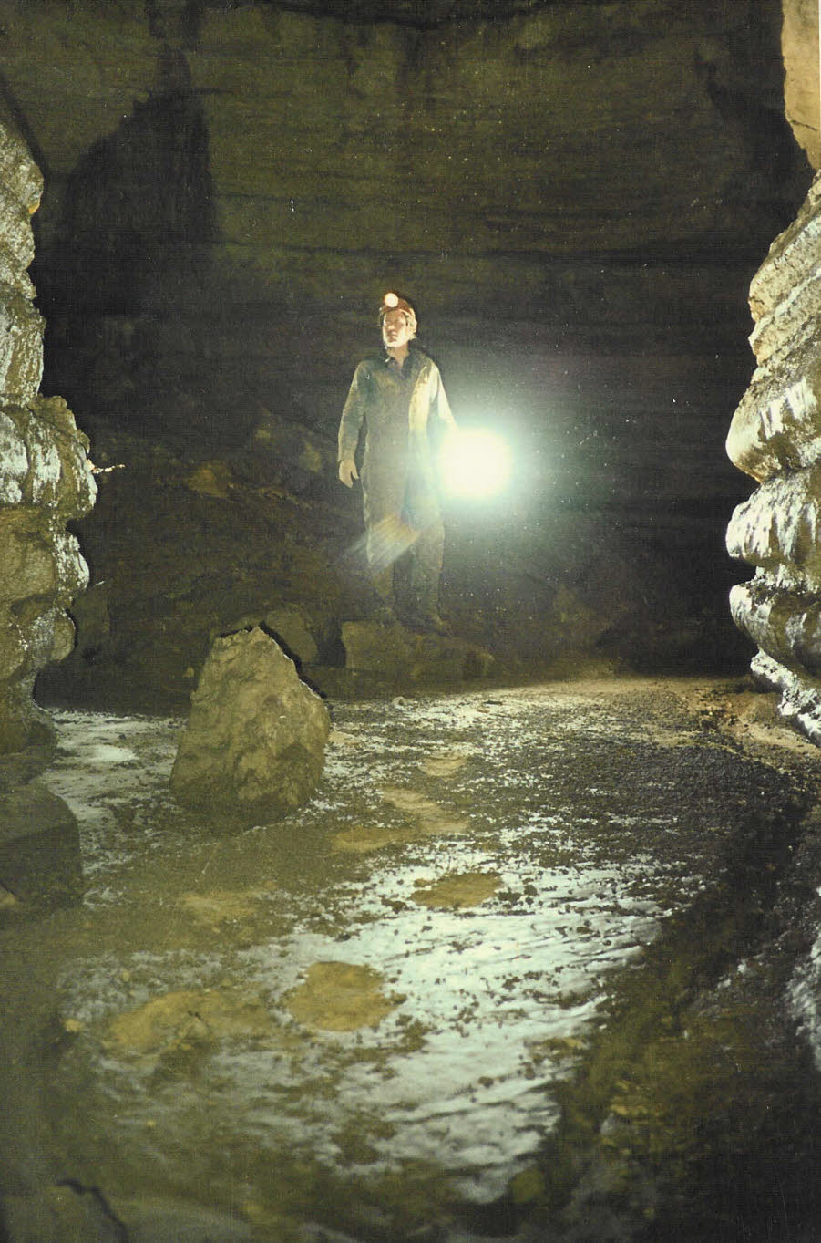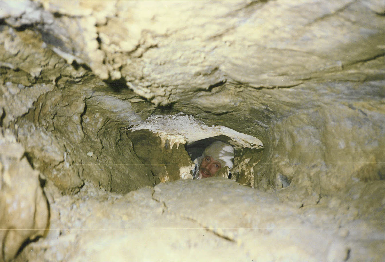 1993 photo of John Ackerman discovering a very tight, muddy and cold stream. |