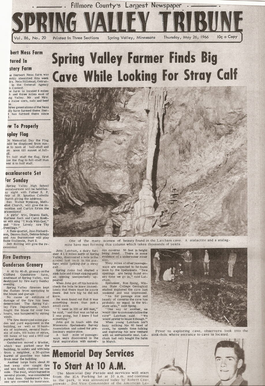 In February 1966 John Latcham purchased a 470 acre farm (A Contract for Deed) located just north of Spring Valley. Several months later, this 27-year old farmer discovered what he surmised was a newly opened sinkhole while searching on horseback for a lost calf. He slid through the narrow opening, and until his eyes adjusted to the inky blackness, he squinted into an expansive seemingly endless cavern. He was astounded at the immense passage that stretched out of sight before him, and upon returning to the surface he immediately proclaimed that he had discovered a vast incredibly decorated underground treasure. |