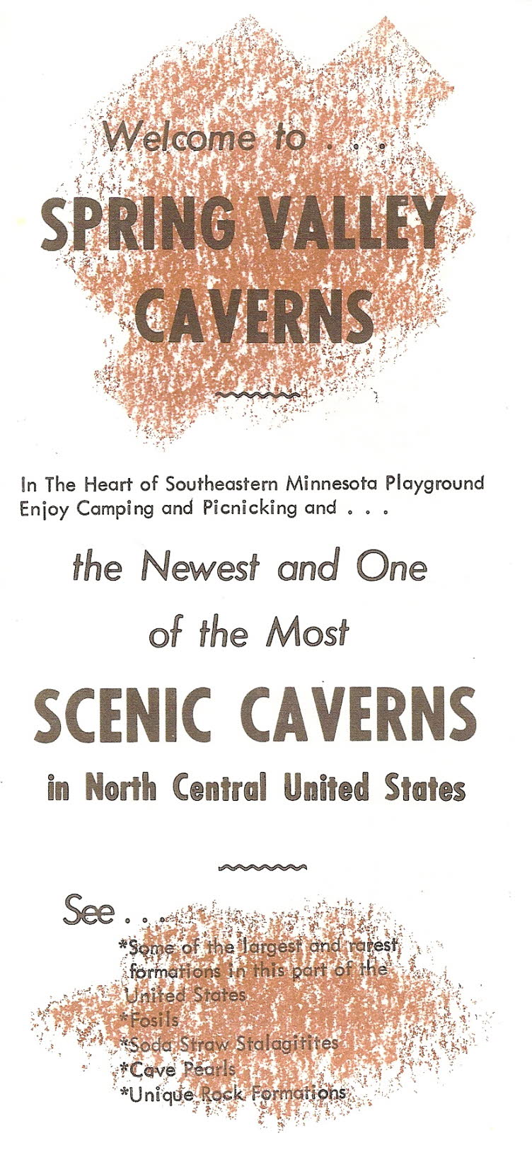 John Latcham hired a road contractor to construct a road to the cave, had electricity brought to the site, hired electricians to illuminate the cave, and construction crews to make a high platform and stairways within the cave. John, Roger, and a team of laborers groomed the trails and spread pea gravel along the main cave passages. Shown above is the front cover of a brochure that touted Spring Valley Caverns as one of the most scenic caverns in the Northern Central United States. |