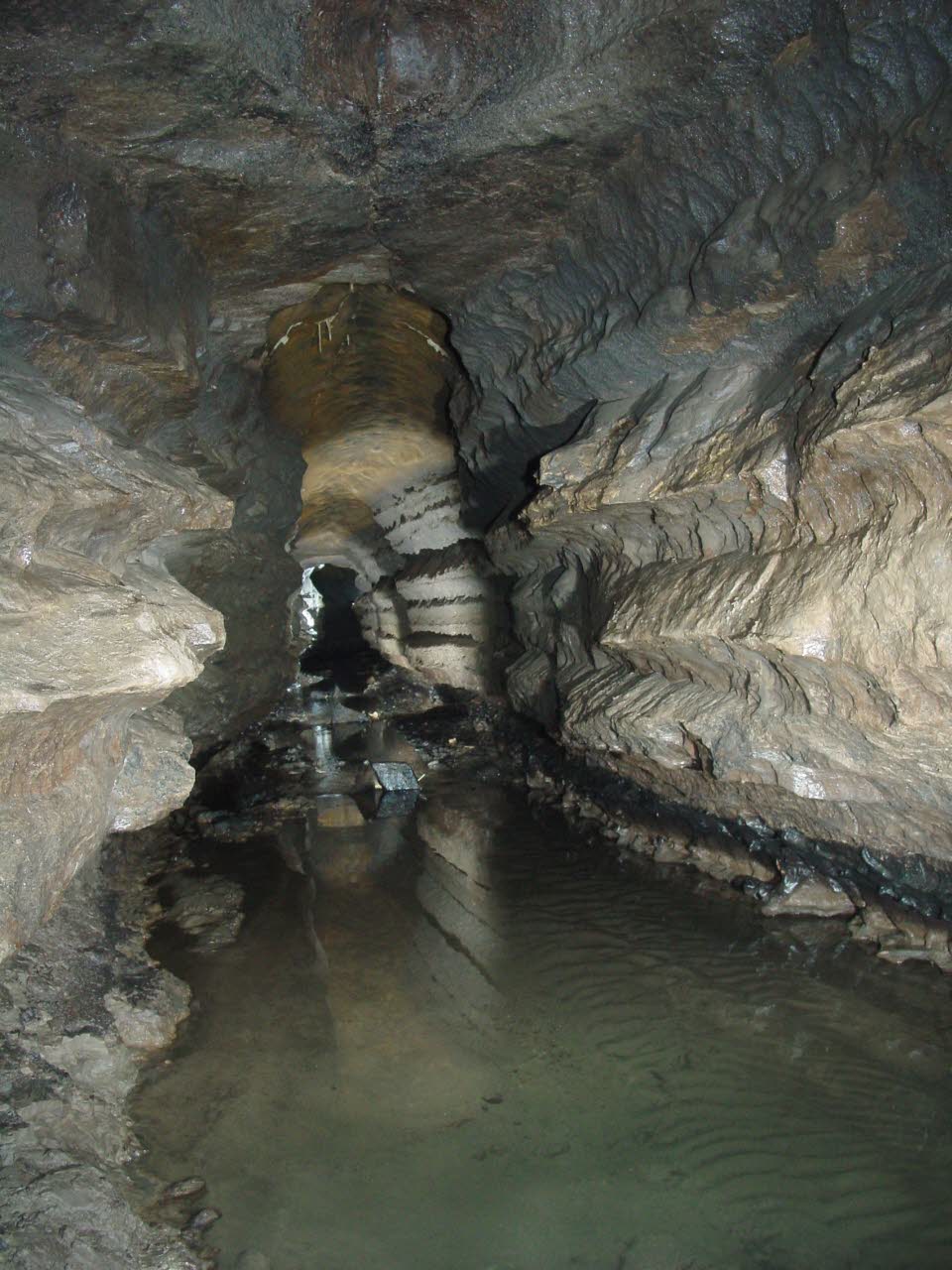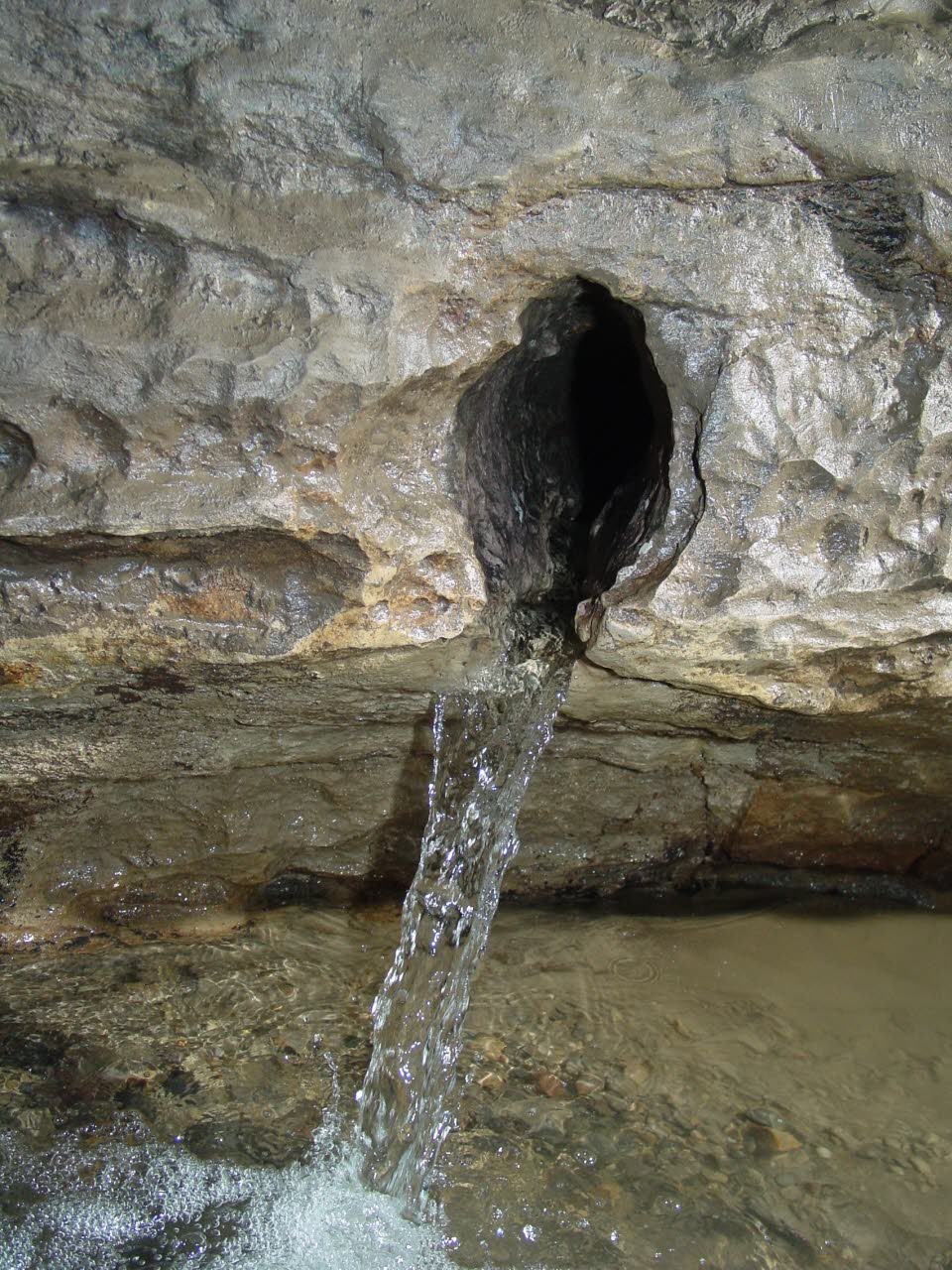 Brisk 48-degree water constantly flows out of this hole alongside a main lower level passage. |