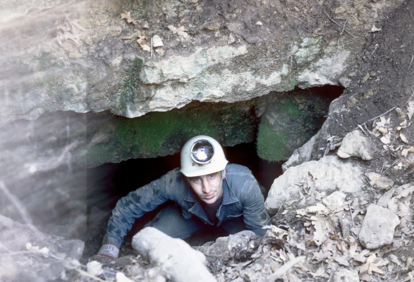 Before the day was over, experienced cavers (such as Jim Rolbiecki pictured here) were summoned to explore the cave. Based on the amount of lichen growing on the outcropping it has been surmised that Spring Valley Caverns could have been open to the surface and entered by previous generations. |