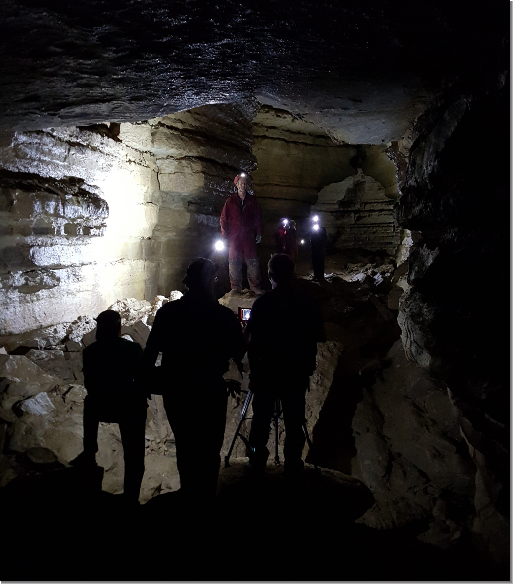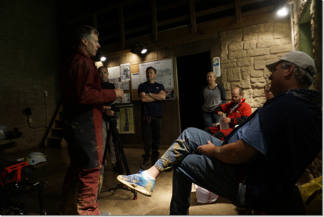 John Ackerman describes the cave layout to the OMNIMAX team who filmed