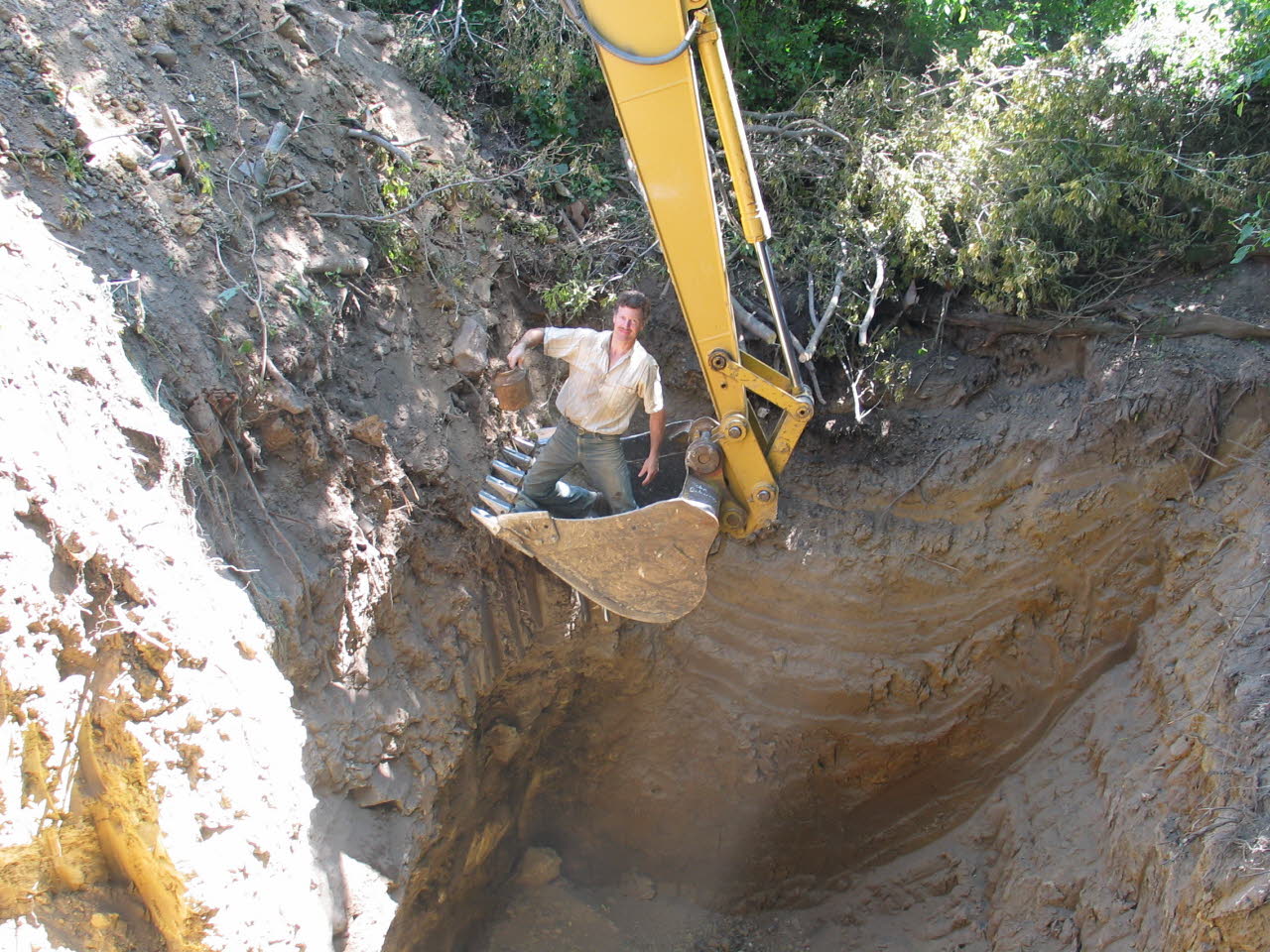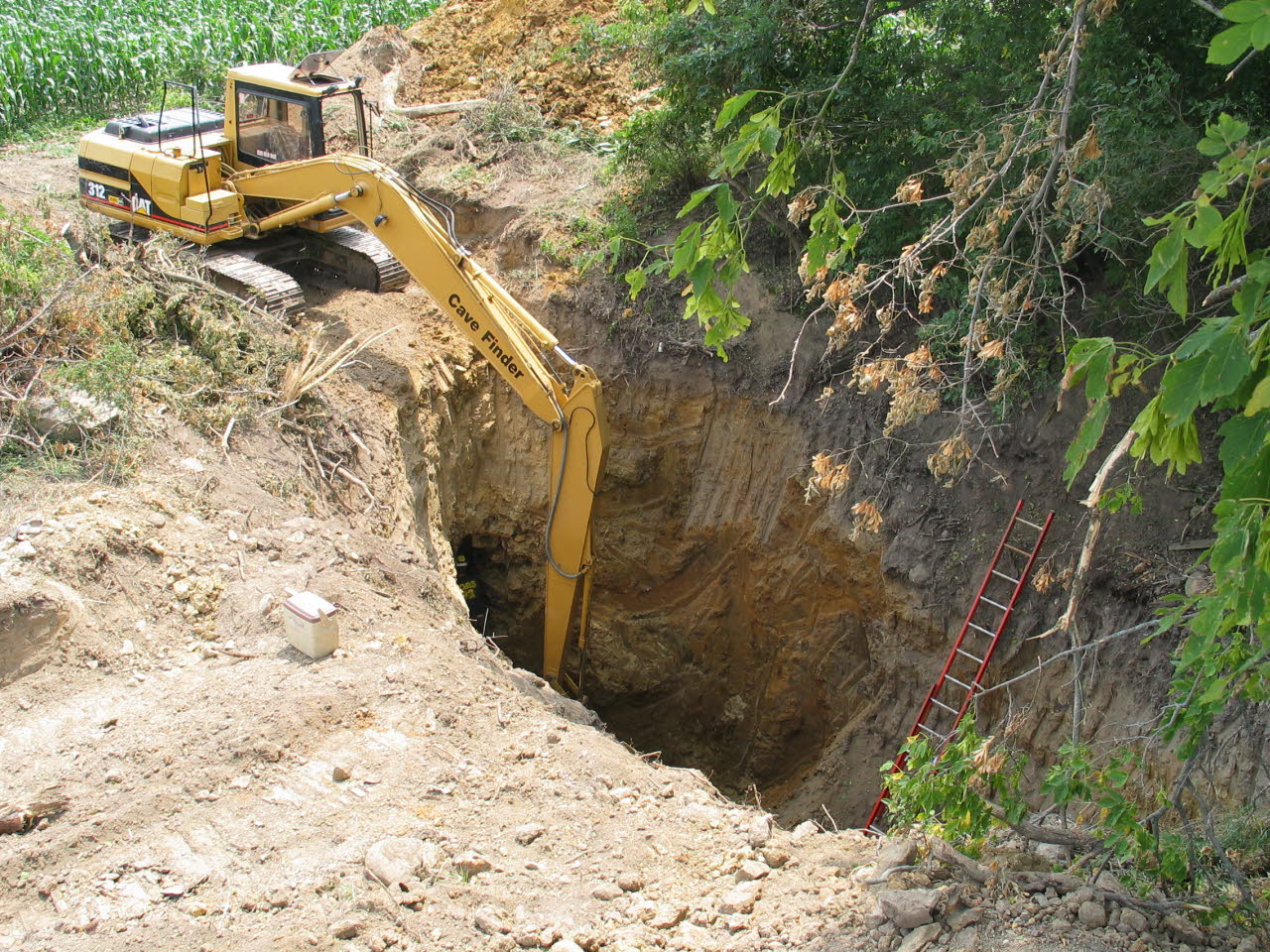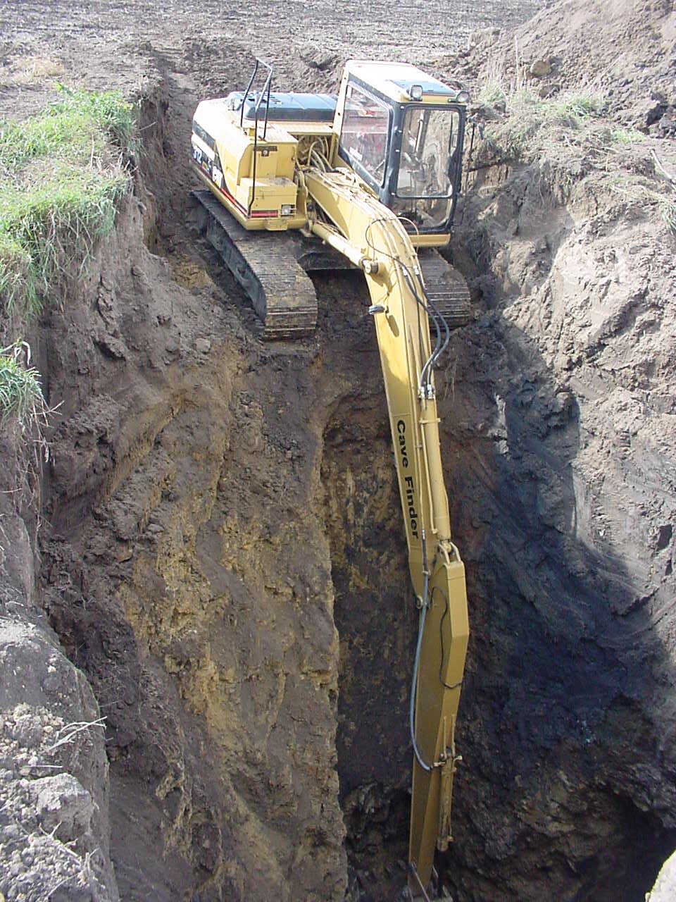 Hand excavating sinkholes in an attempt to discover caves was risky business. In 2002 John purchased a trackhoe, and promptly modified the machine so it could reach greater depths. |