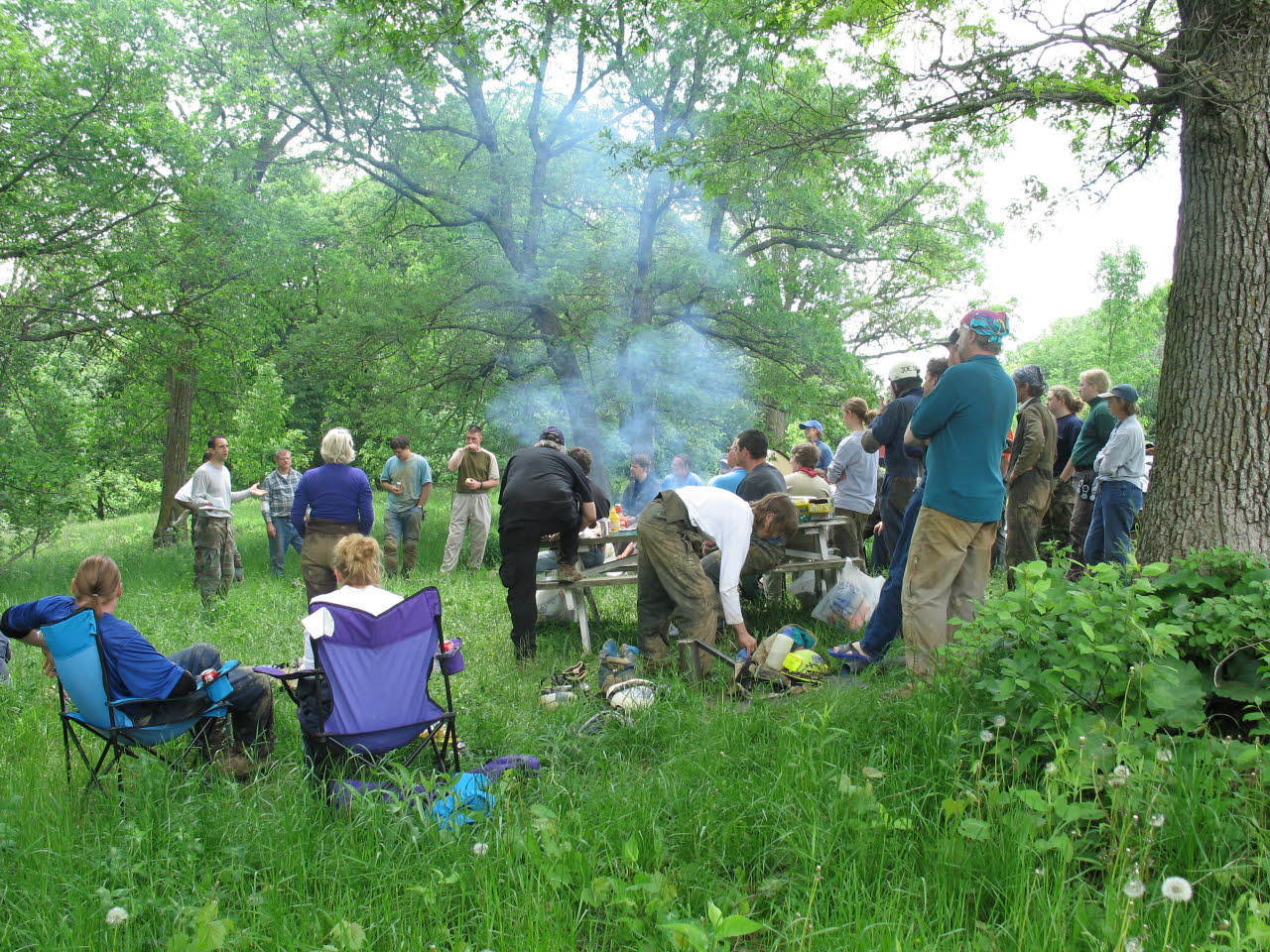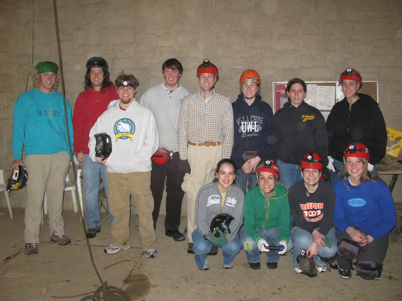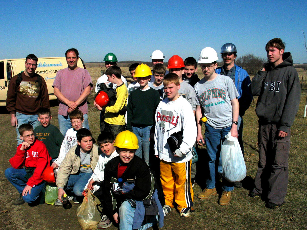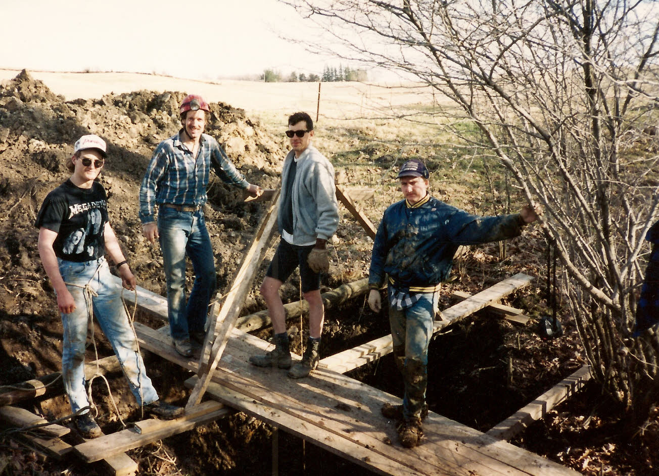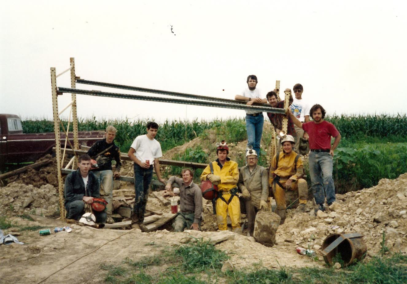 A 1991 group effort at the Cave Farm, focused on finding a new cave. Battery powered lights had just become available as seen on several helmets to the far left of the photo. |