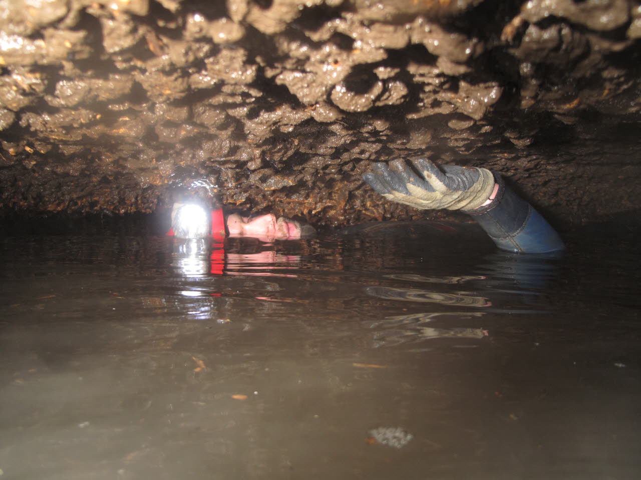 Sometimes we inch our way through low water spaces in hopes of discovering miles of cave passages. When the air space diminishes to several inches it is important to move forward very slowly so water does not splash down your nose and into your lungs. |
