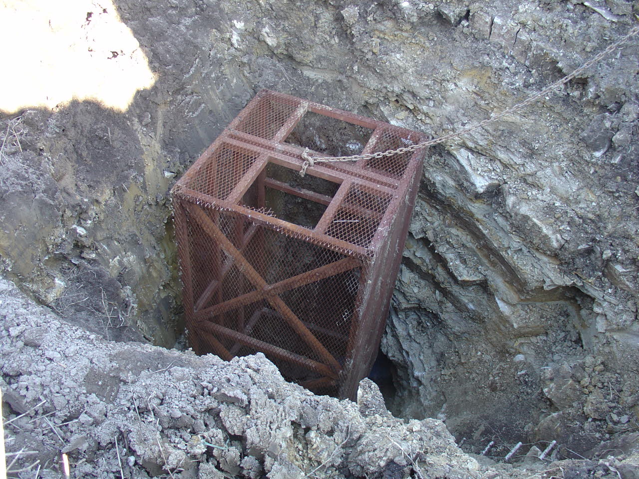 A specially constructed man cage is pressed into service to protect the cave explorer from falling rocks or collapsing walls in deep sinkholes. |