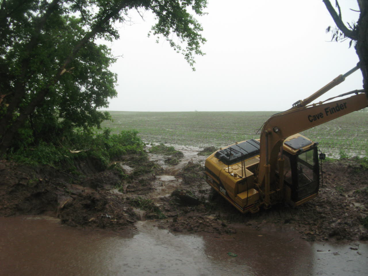 In this case the Cave Finder had just dug 40’ down into the base of a sinkhole, where a small cave was discovered. A sudden torrential rain event occurred and rapidly filled up the sinkhole. John extended the boom against a tree to prevent the machine from sinking out of sight. Again, heavy equipment rescued the Cave Finder. |