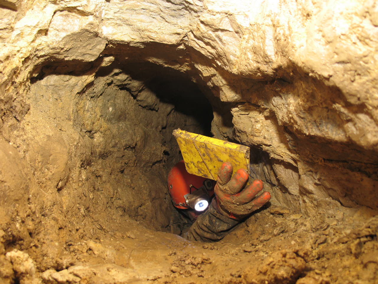 Beginning to uncover what was originally a spacious cave passage. |