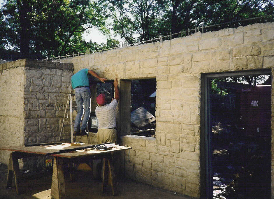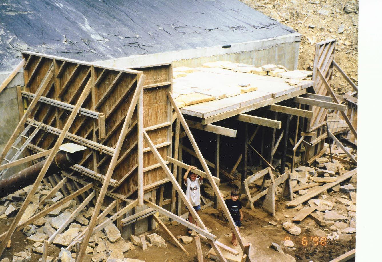 Work began on the limestone entrance arch. The pipe on the left of the photo enters the cave in a lower level wall and serves as a bat access. |