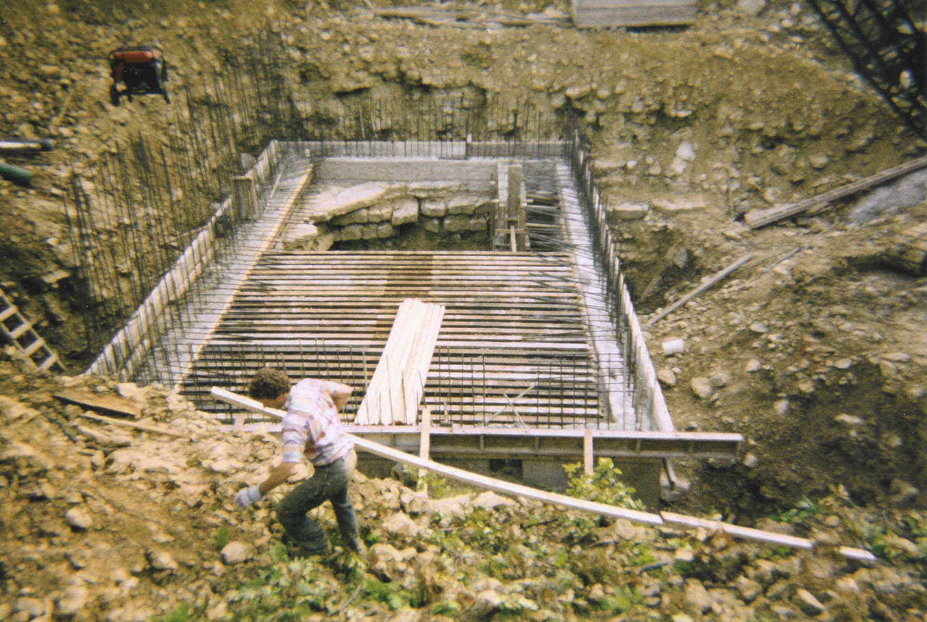 Work began on the main level of this three story 38’ tall building. Tons of rebar were utilized in the construction. |