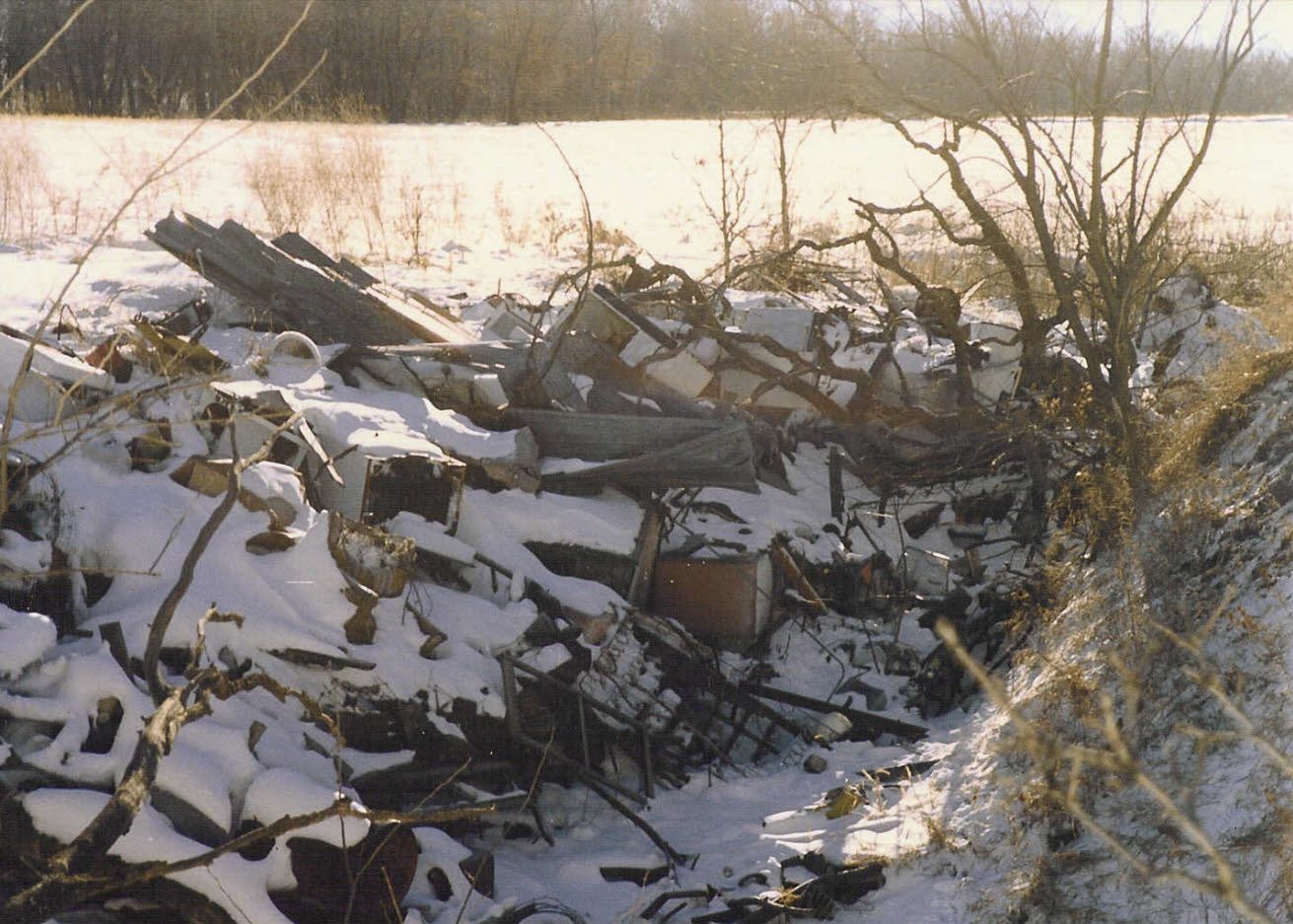 Dozens of decomposing batteries and leaching farm chemical barrels were uncovered. A large section of Spring Valley Caverns was found to run directly under this sinkhole. A trail of trash runs hundreds of feet through the cave before dropping into a series of pits and into the water table. |