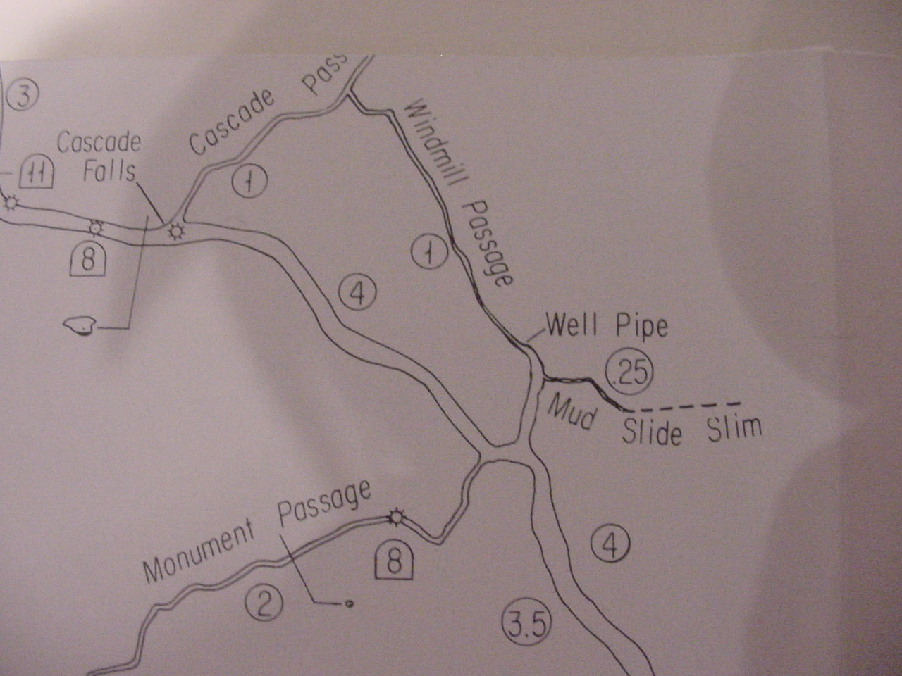 Two hundred pounds of dead weight was lowered and raised down the shaft before John's journey, to assure smooth operation. Due to the depth and slight shaft hole deviation, it was not possible to visually see the bottom. Initially there was a concern about the oxygen level, but this proved to be an unwarranted fear. |