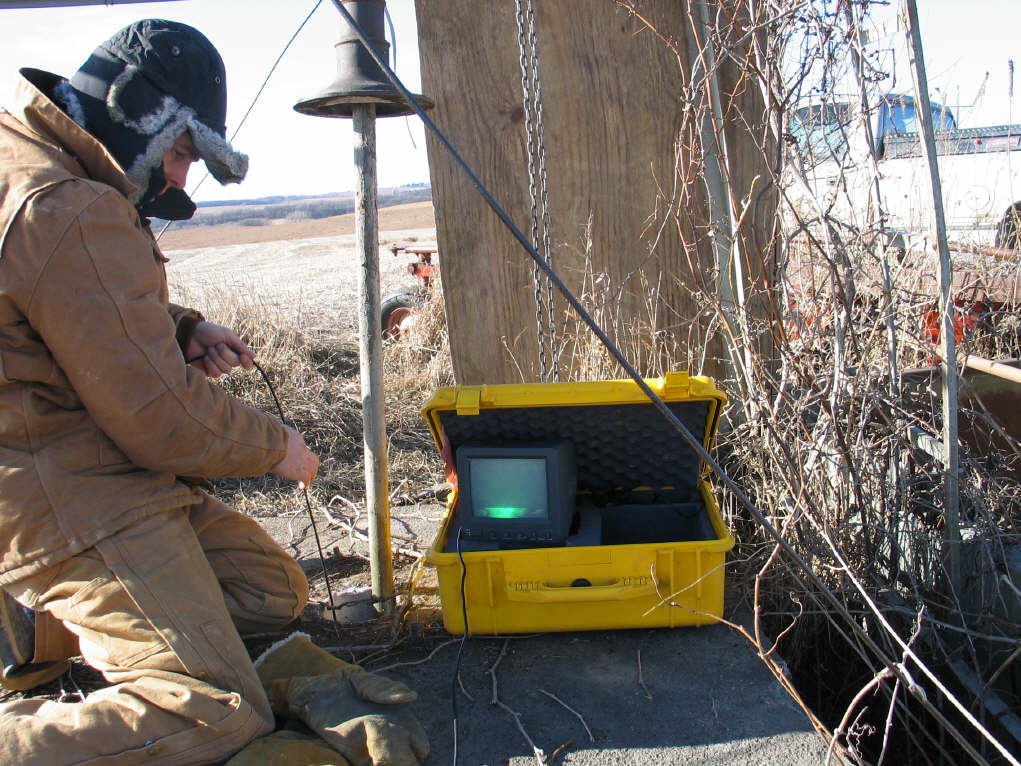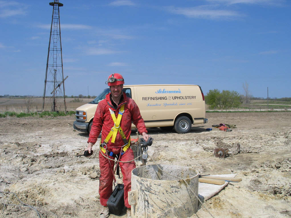 Both the pump handle assembly and well pipe were winched up a few feet so accurate measurements to the cave ceiling and floor could be established. Phil Gemuenden lowers his camera to obtain the data and also to glimpse at the cave below him. This was an exciting day! |