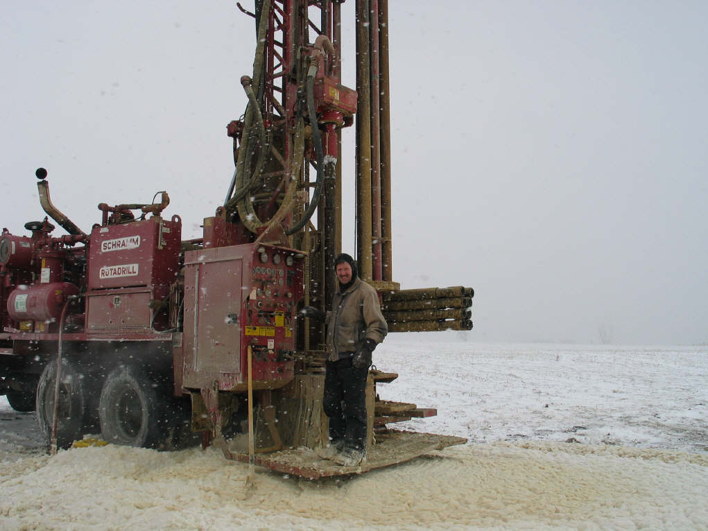 It was a bitterly cold winter day. The first 5.25 inch diameter hole was drilled to a depth of 190 feet and missed the cave. Extreme anxiety set in, fearful that the proceeding test holes may also miss the mark. |