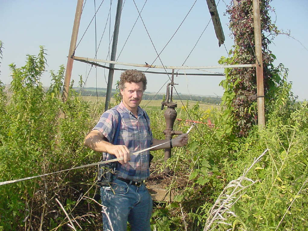 This old windmill is poised directly over Cold Water Cave. The well pipe had inadvertently intersected the cave, and was eventually discovered by the original cave explorers after they traced an eerie banging noise. The ghostly noise was found to be the result of the lift rod clattering in the steel pipe! Here John measures the amount of land he wishes to purchase, using the windmill as the benchmark. |