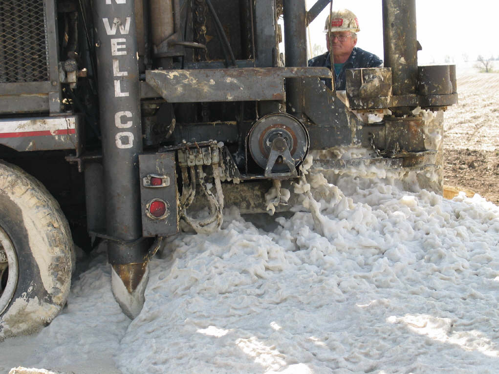 Water, mixed with a foaming agent, along with extreme air pressure, was injected through the end of the drill bits. The foam helped to carry out the limestone residue. |