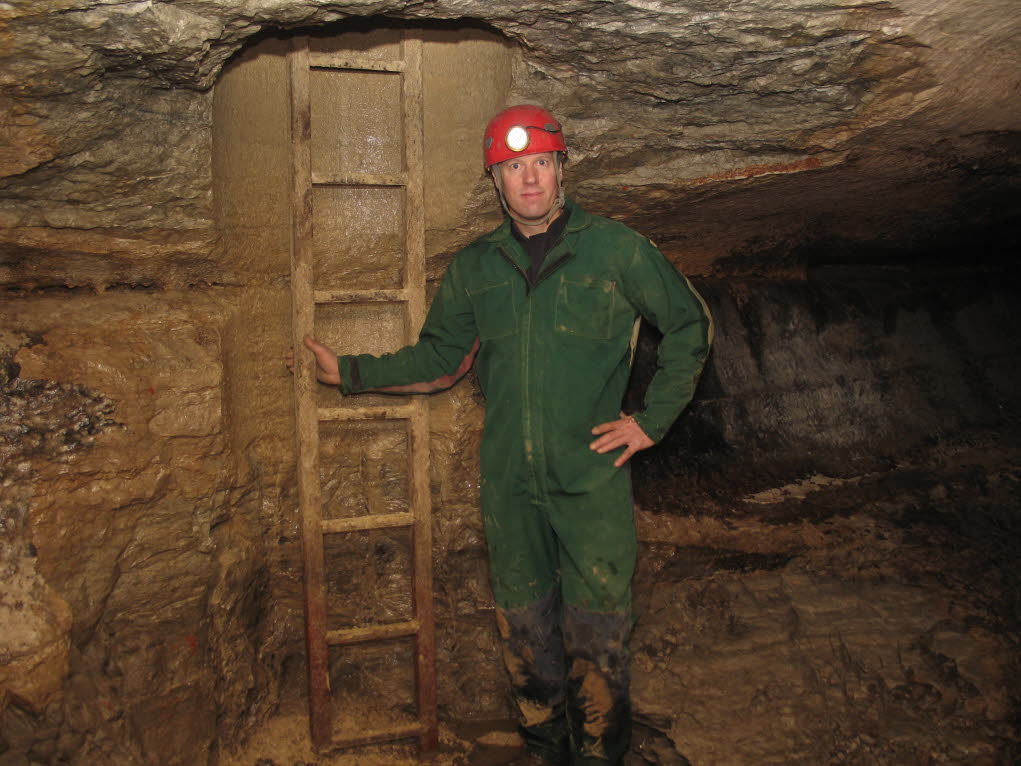 Phil made each ladder section to fit together in series. Saint Agnus Church is visible in the background. A suitable limestone building is being designed, and will be constructed over the access shaft. |