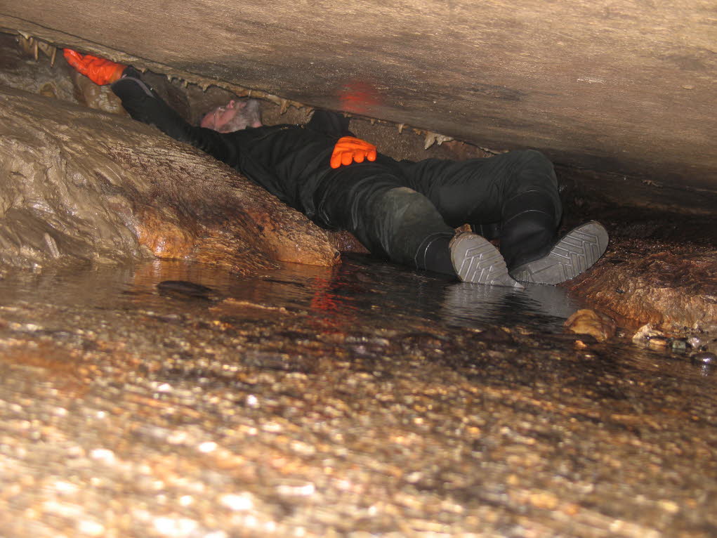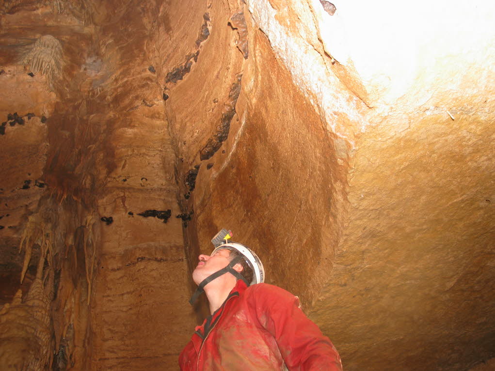 Clay Kraus peered up into a large void in a remote section of the cave. Clay and John Ackerman subsequently removed enough rock to gain access into the void and discovered new passages and tall domes. READ THE STORY |