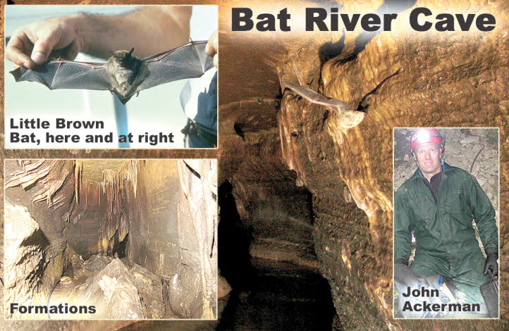 Bat River Cave, northwest of the village of Fillmore, turned out to be a large cave system once experienced cavers Ackerman, John Preston and Phil Gemuenden dove through a pitch black, water-filled passage at the end of the known cave in 2006. They surfaced to hear thundering sounds of pouring water. Removing their diving gear, walked around a bend in the passage and discovered a tremendous waterfall crashing down into a large, cavernous room. After scaling the waterfall they found that the source of the water was coming from an upper level stream, running along the floor of a 20-foot tall passage. By evening they had followed the passage for over one mile before calling it a day.